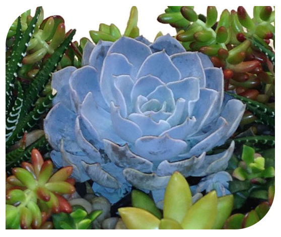 Elegantly arranged seasonal succulents with river rocks in a round ceramic pot.