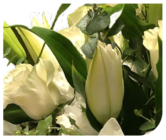Our designers will create an exquisite arrangement of all white fresh seasonal flowers in a tall vase lined with Ti-leaf